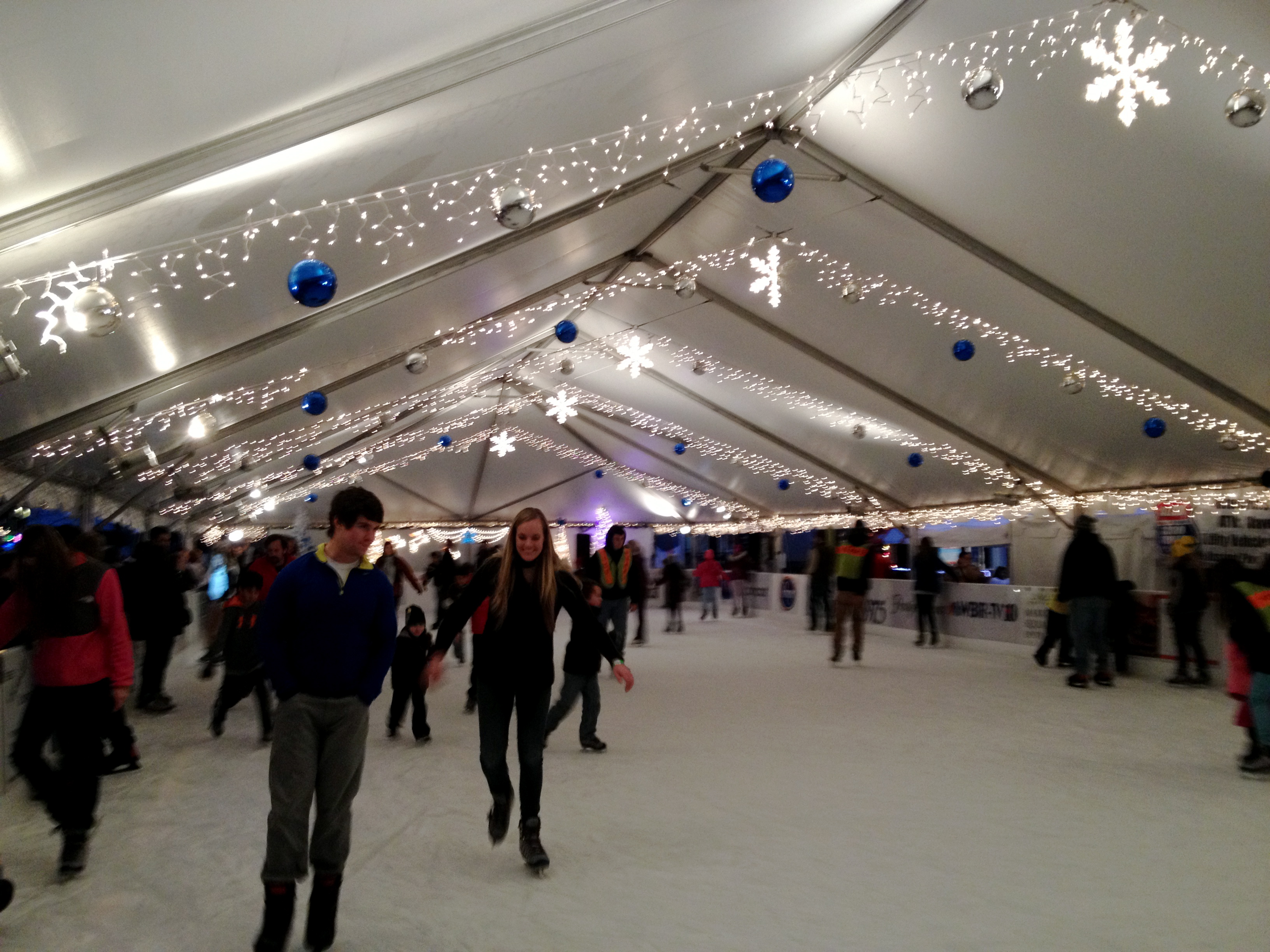 When we got there it was about 45 degrees outside, which was absolutely perfect for skating. The crisp cool air added to the fun winter atmosphere and it was cold enough that you could bundle up but not get overheated while on the ice. The rink was decorated for the holidays with Christmas lights and oversized ornaments. Music was playing and everyone was skating and laughing and wearing their winter coats.