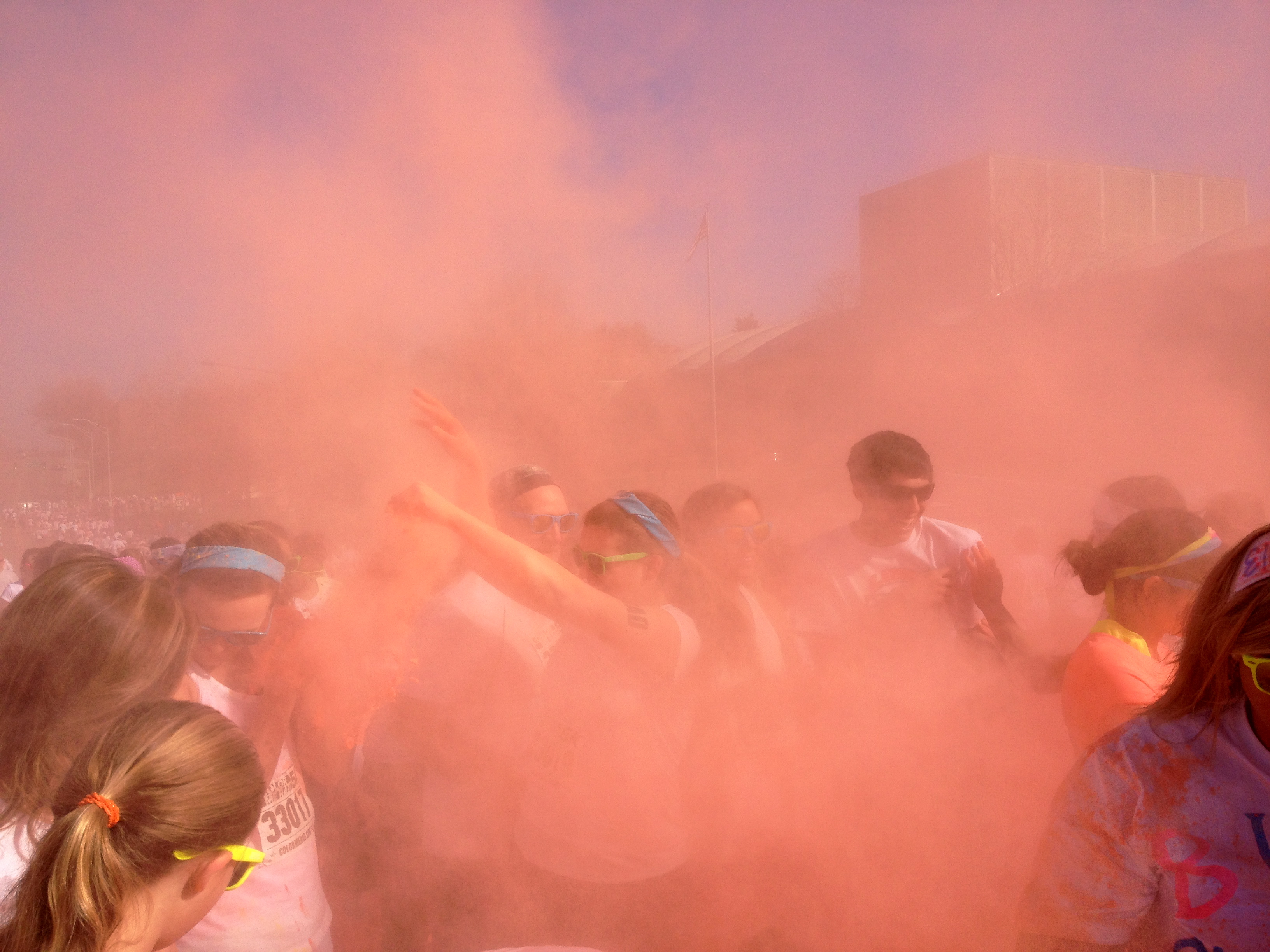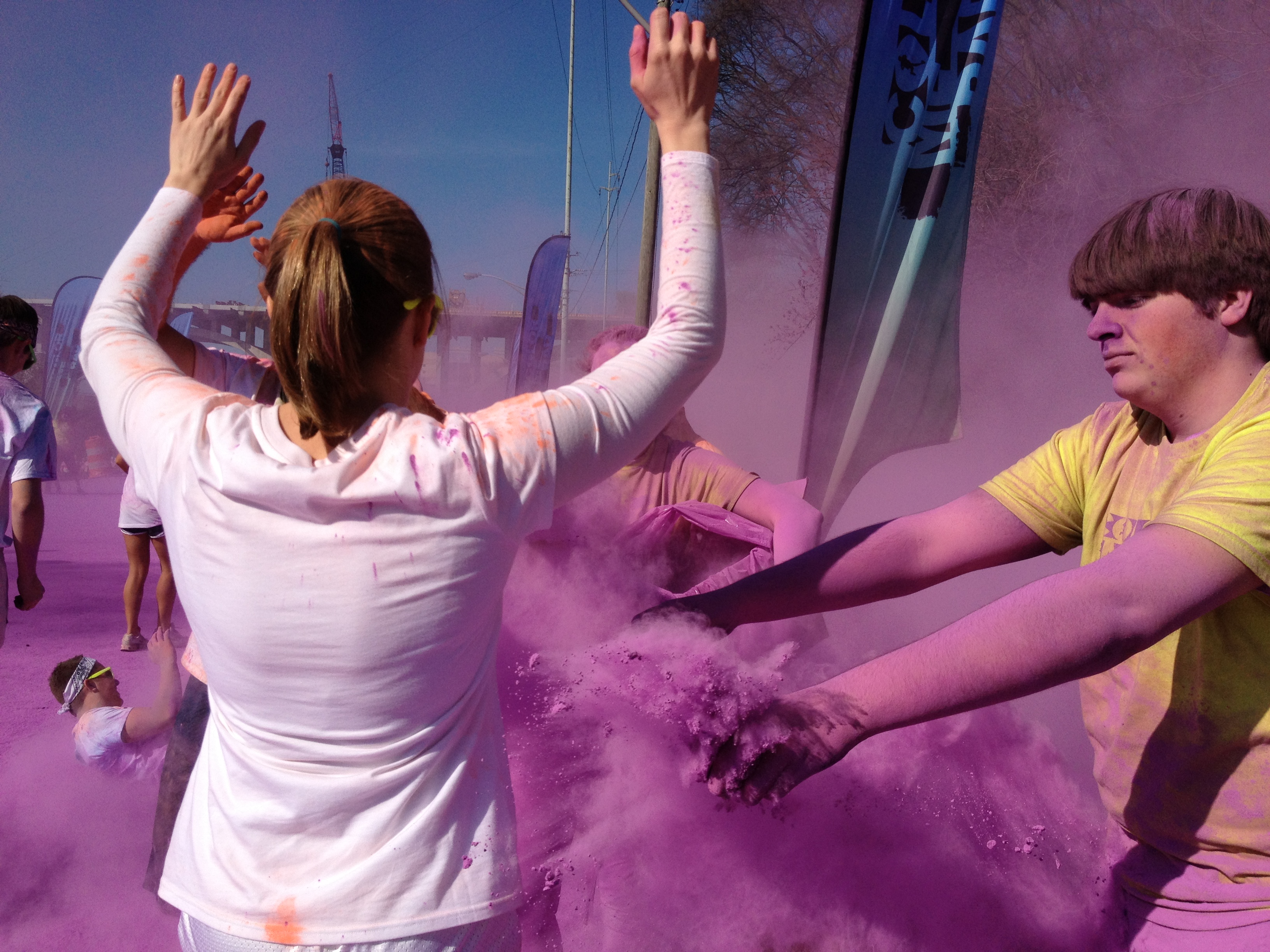 For my first race I wanted to do something fun, something that would be a memorable experience. My friend Erin (who made candles with me on week 3) suggested Color Me Rad, which benefitted East Tennessee Children’s Hospital. She could not have picked a better race. The thing that separates Color Me Rad from other 5Ks is that you are pelted with green, pink, purple, yellow, and orange color bombs (colored cornstarch) throughout the race. It is reminiscent of Holi, the festival of colors. The photo below is of me releasing my first color bomb over our friends before we started. Please note that my clothing is still clean and white at this point.