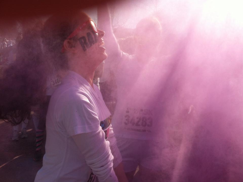 When I woke up the morning of the race I was skeptical of how it would go. It was 35 degrees, I had a chest cold, and my knee was already bothering me. But, I layered up and decided it was too late to back out. Fortunately, it warmed up a bit to a sunny 43 degrees (6 degrees Celsius for you kids abroad) by the time our wave started at 10 a.m. However, the run and colorful distractions quickly warmed us up.