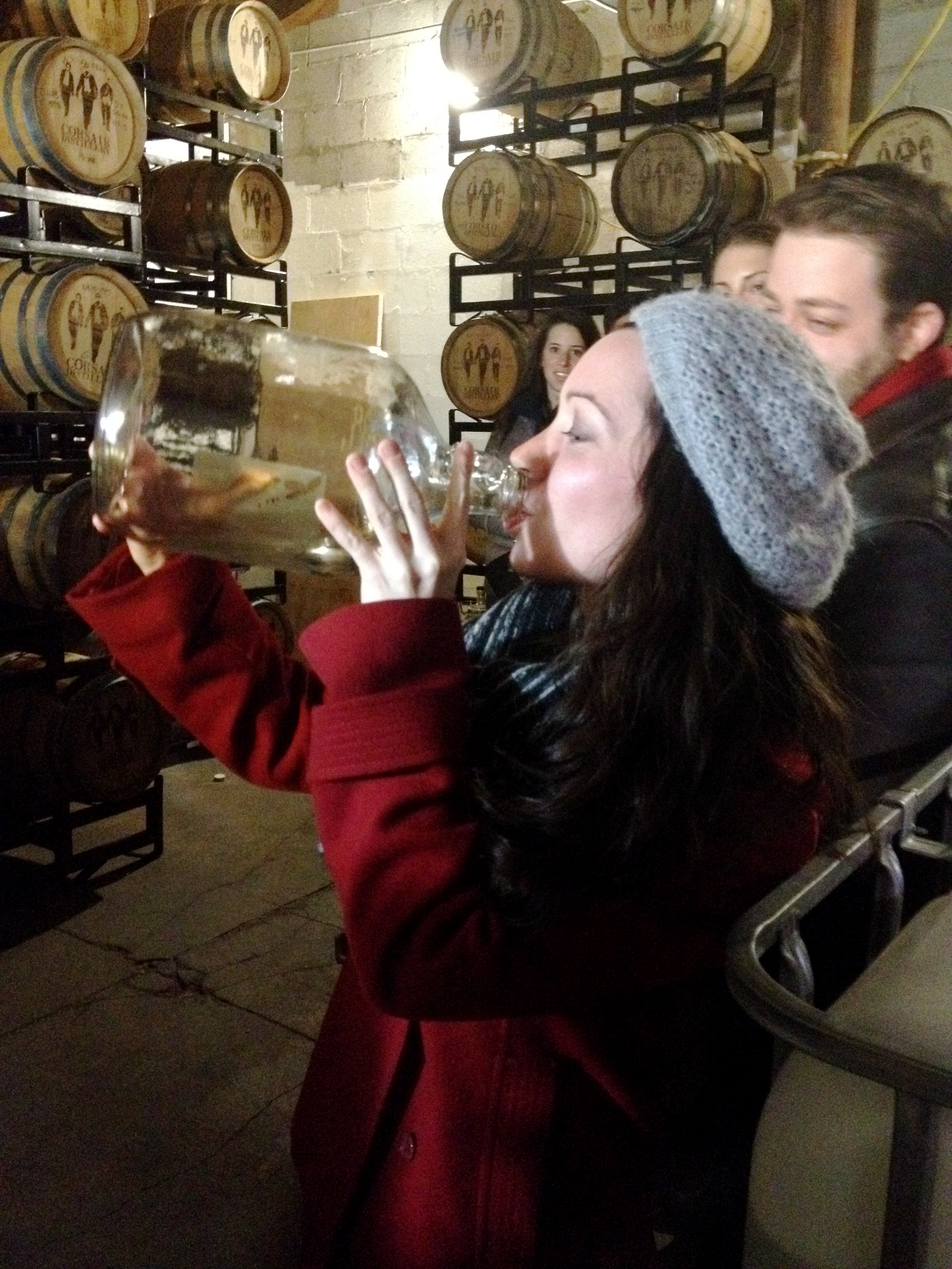Following the tour we had a tasting of some of Corsair’s products. The tasting included their gin, spiced rum, moonshine, quinoa whiskey, and triple smoked whiskey. Loren and I aren’t big girls, so tasting straight liquor got a little overwhelming by the 5th sample. In fact, our lips went numb rather quickly. Usually I dilute whatever liquor I’m drinking in a large glass of coke (sorry connoisseurs) so I liked being able to taste the unique flavors of each drink. While I normally dislike gin (I think it tastes like rubbing alcohol), I really liked Corsair’s gin. It had a very piney flavor. Also, I could really taste the difference between the quinoa whiskey and the triple smoked whiskey .