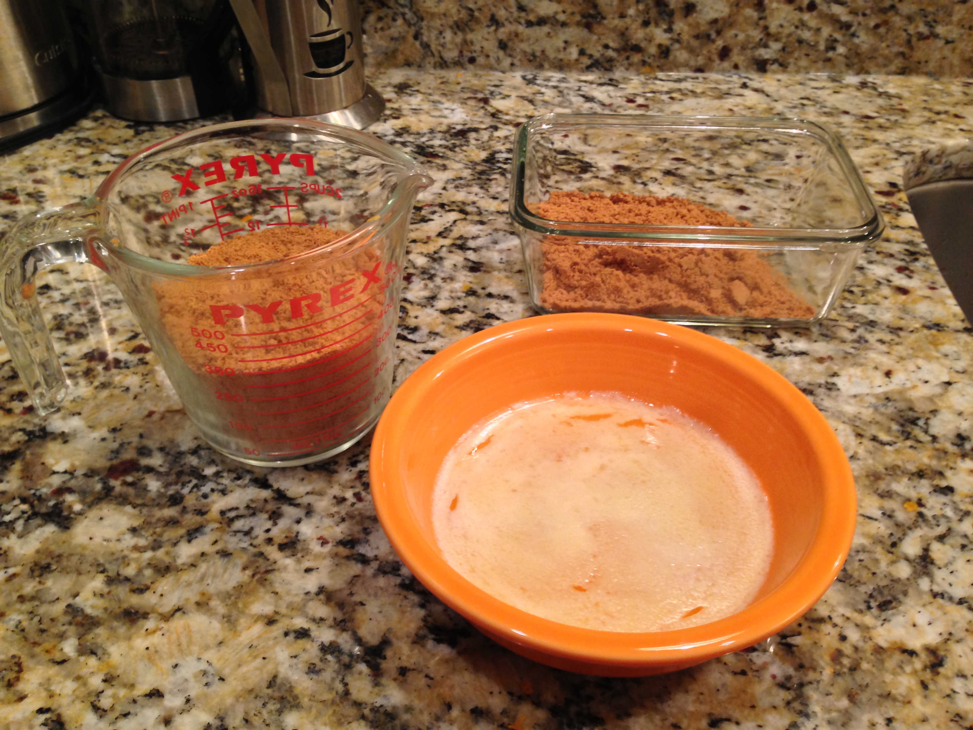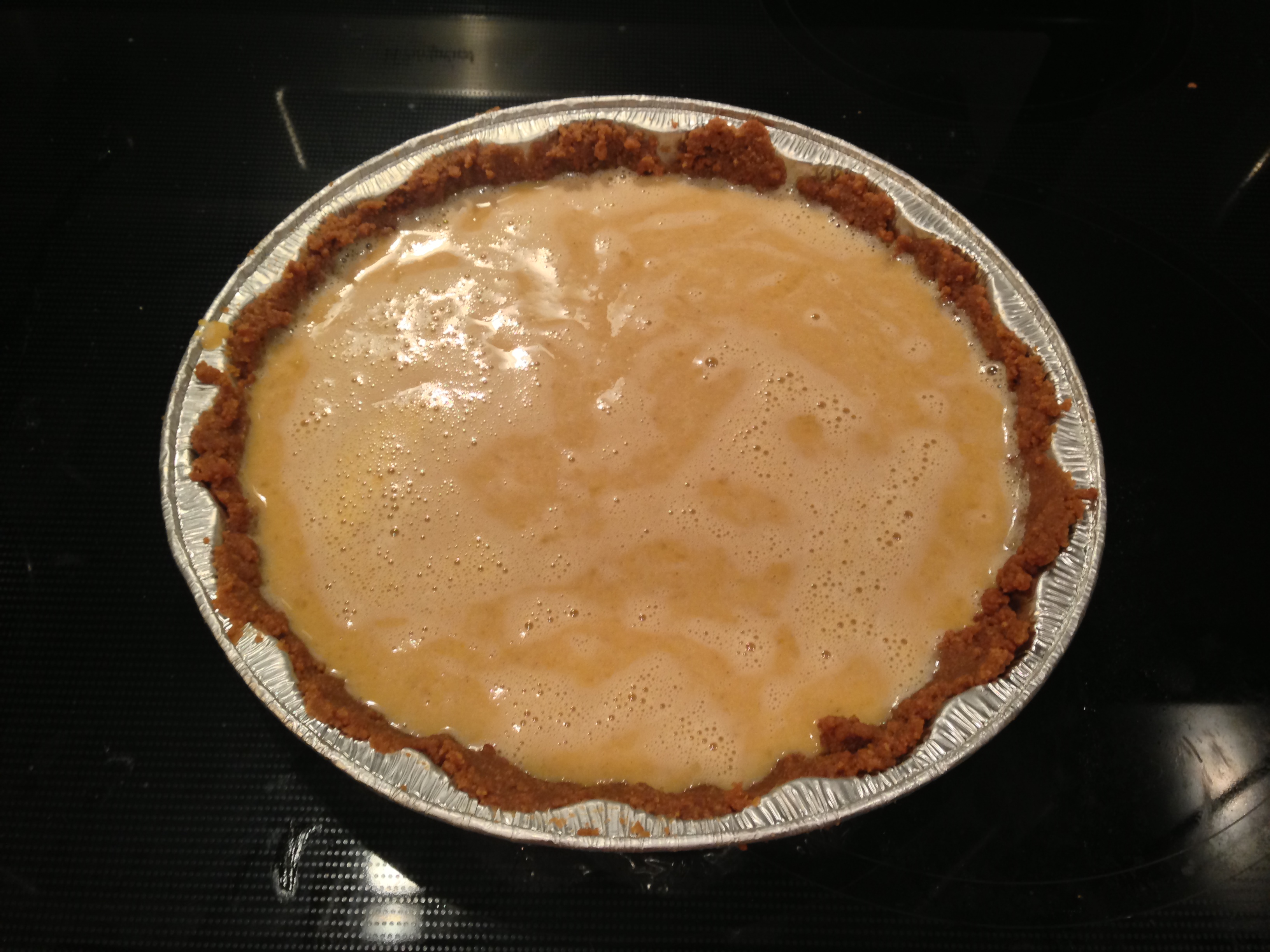 Instead of making the crust completely from scratch, we cheated a bit and used gingerbread cookies. (This also made for a yummy mid-baking snack.) We threw a box of the cookies in the food processor and crushed them until all that was left was crumbs. This took longer than expected, apparently food processors are not made to crumble cookies.