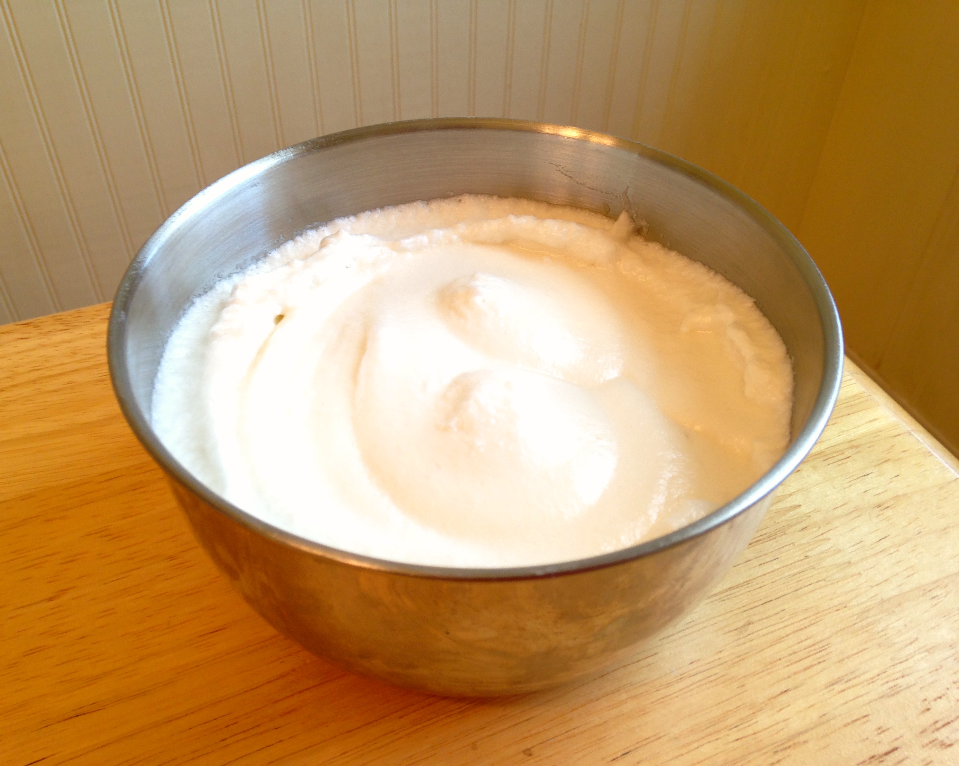 Some recipes skip egg whites. However, this helps give the custard its thickness. The recipe said to beat 4 egg whites and 1/4 cup sugar until stiff, glossy peaks formed. I had never beaten eggs for a dessert before so I was surprised just how fluffy they got. This took a while to accomplish. Although my recipe didn’t explain this, the egg whites should be at room temperature and the sugar should be added in gradually. I probably should have beaten them longer, but I was concerned about over-beating them and having to start over.