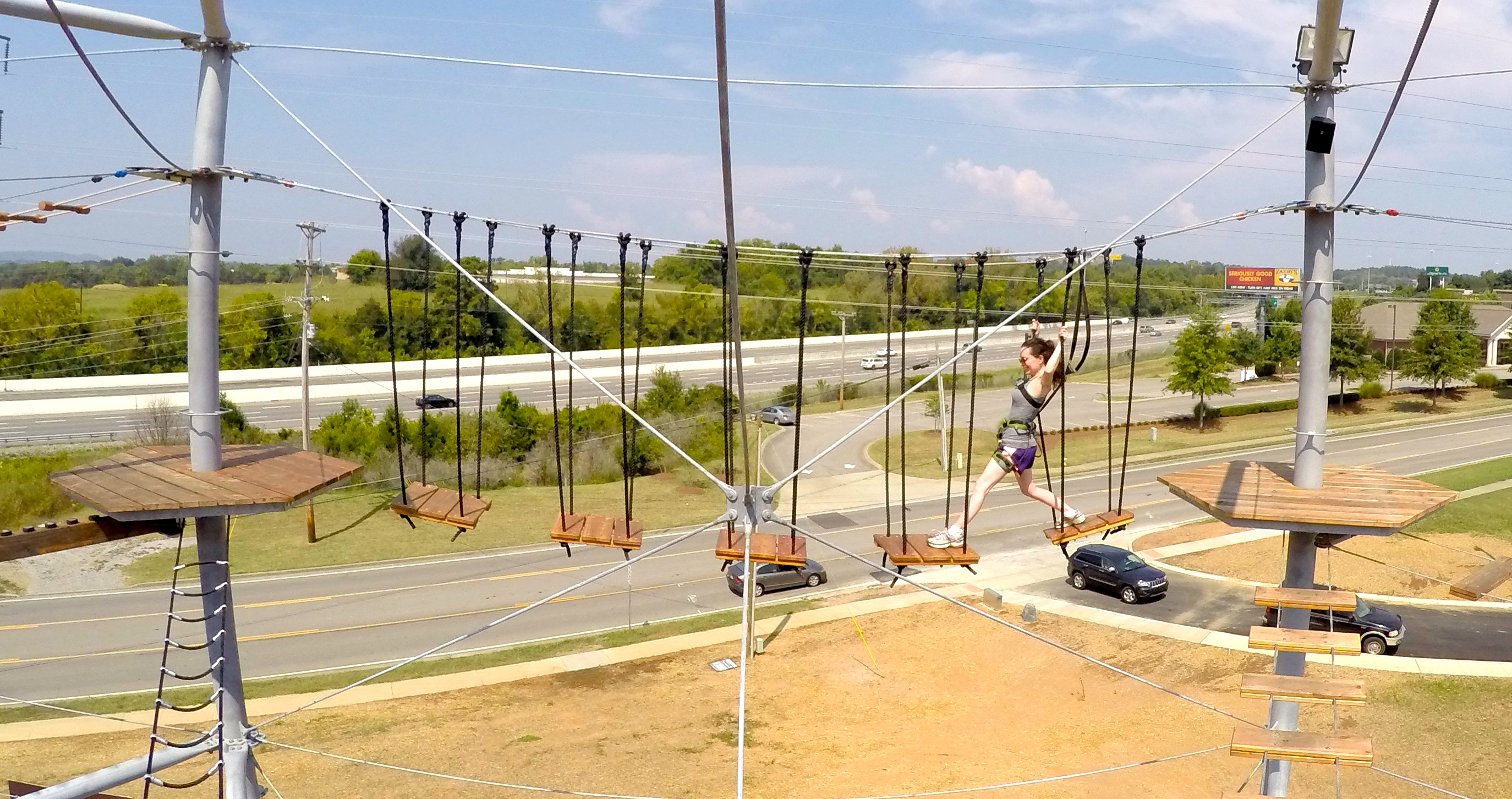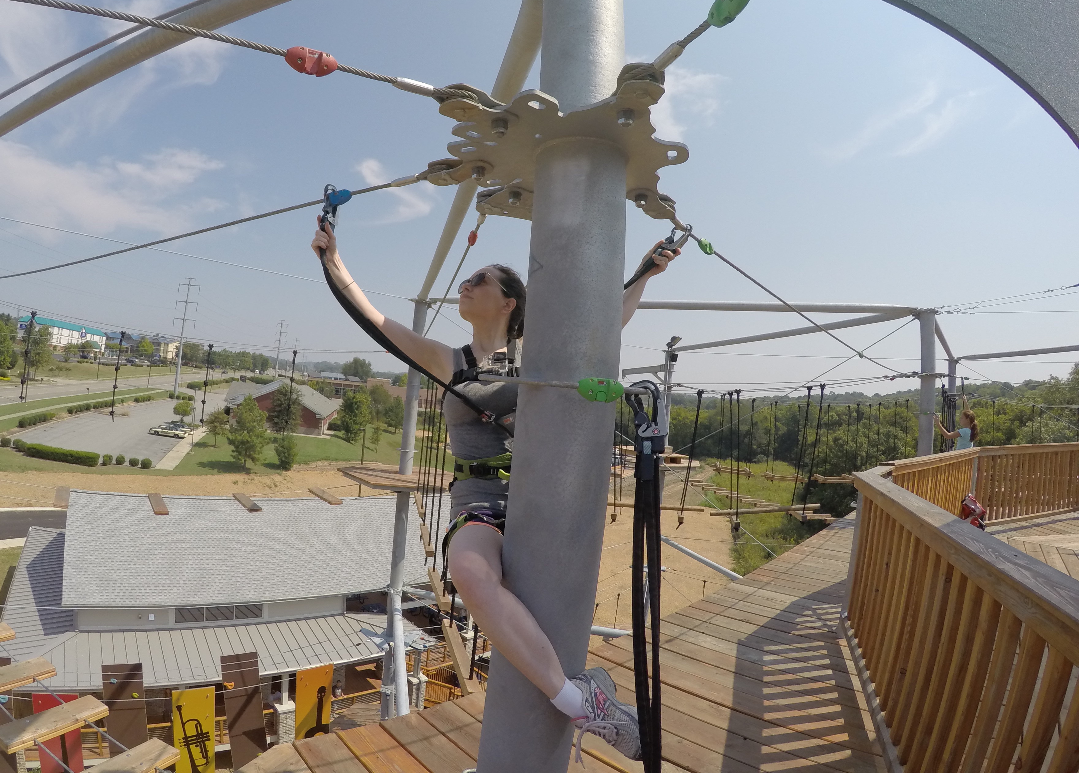 Soar Adventure Tower has a special “fallstop” belay system that keeps you locked in and ensures that the climber is never detached from the safety line. You are attached to the safety line by two carabiners and, once attached, the interconnected carabiners can only be opened one at a time. To unhook and go from element to element you had to push a carabiner into a “Tweezle,” which allowed you to detach the other carabiner and move it to a different line. Being short, I had to get creative about this process and hang on to the polls like a monkey to reach the wires.