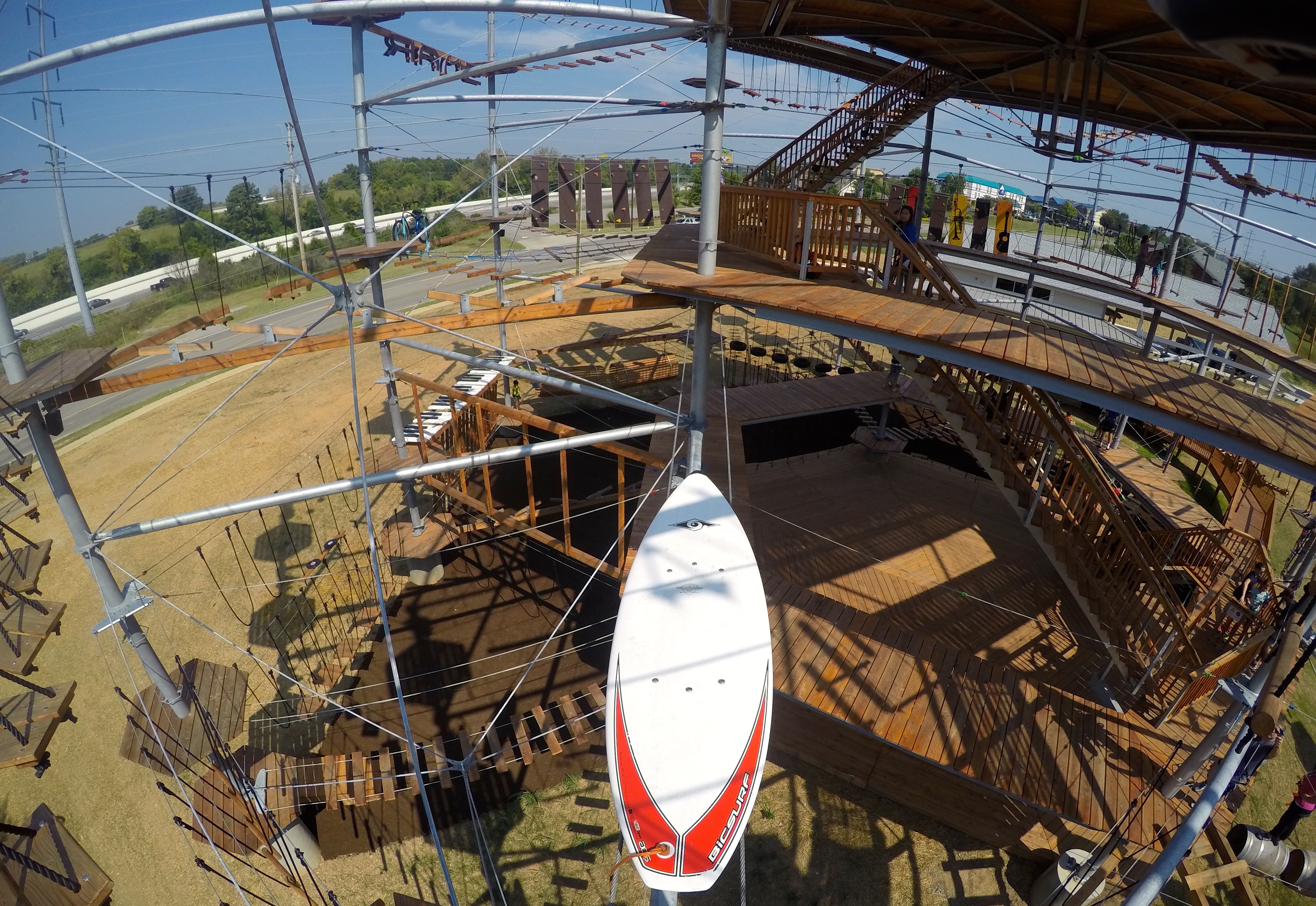 The tower has 4 levels with several individual platforms. Each platform connects you to 3 different elements, for a total of over 110 climbing adventures. The elements range from rock walls to monkey bars to swinging planks you have to cross.