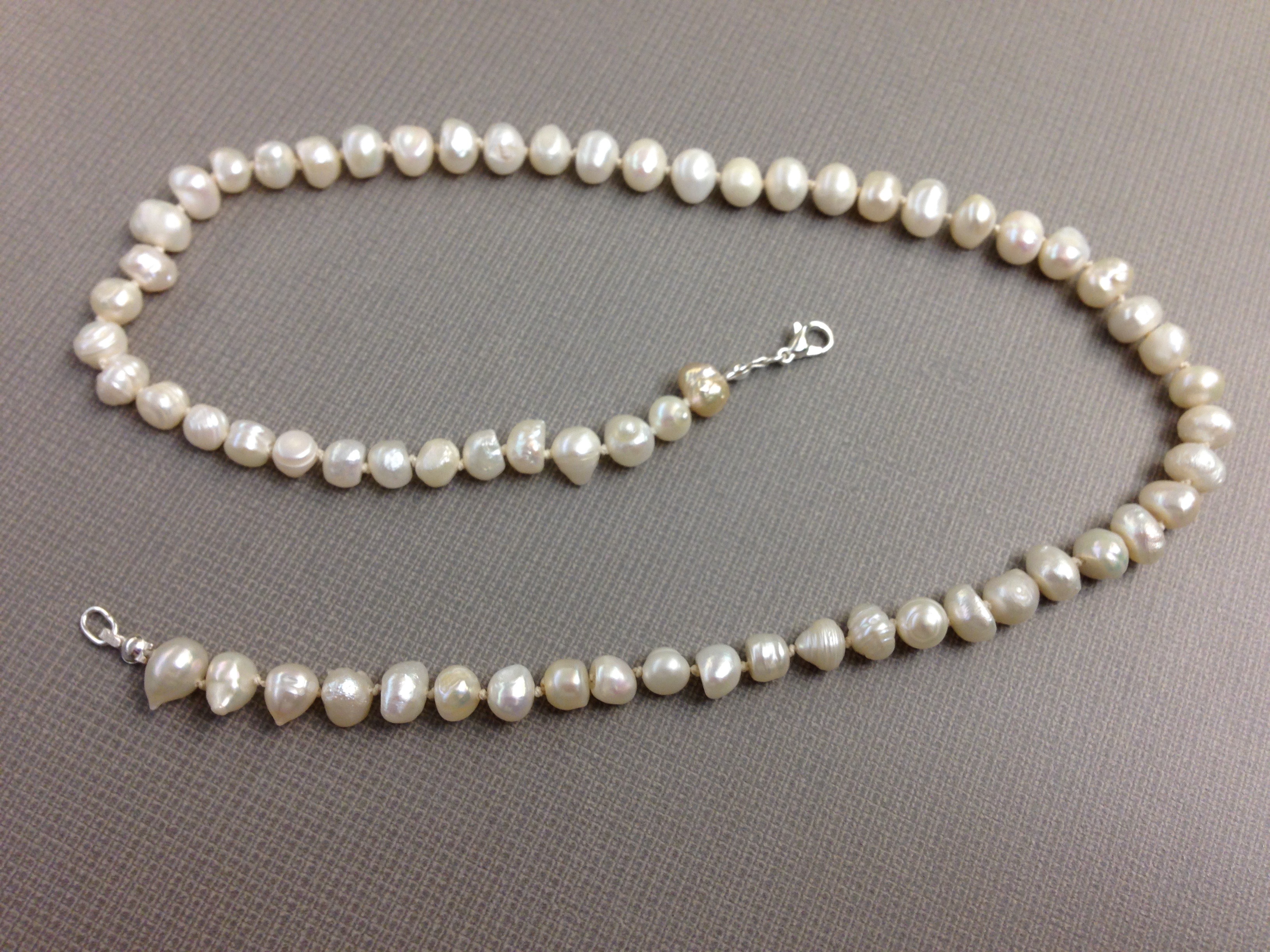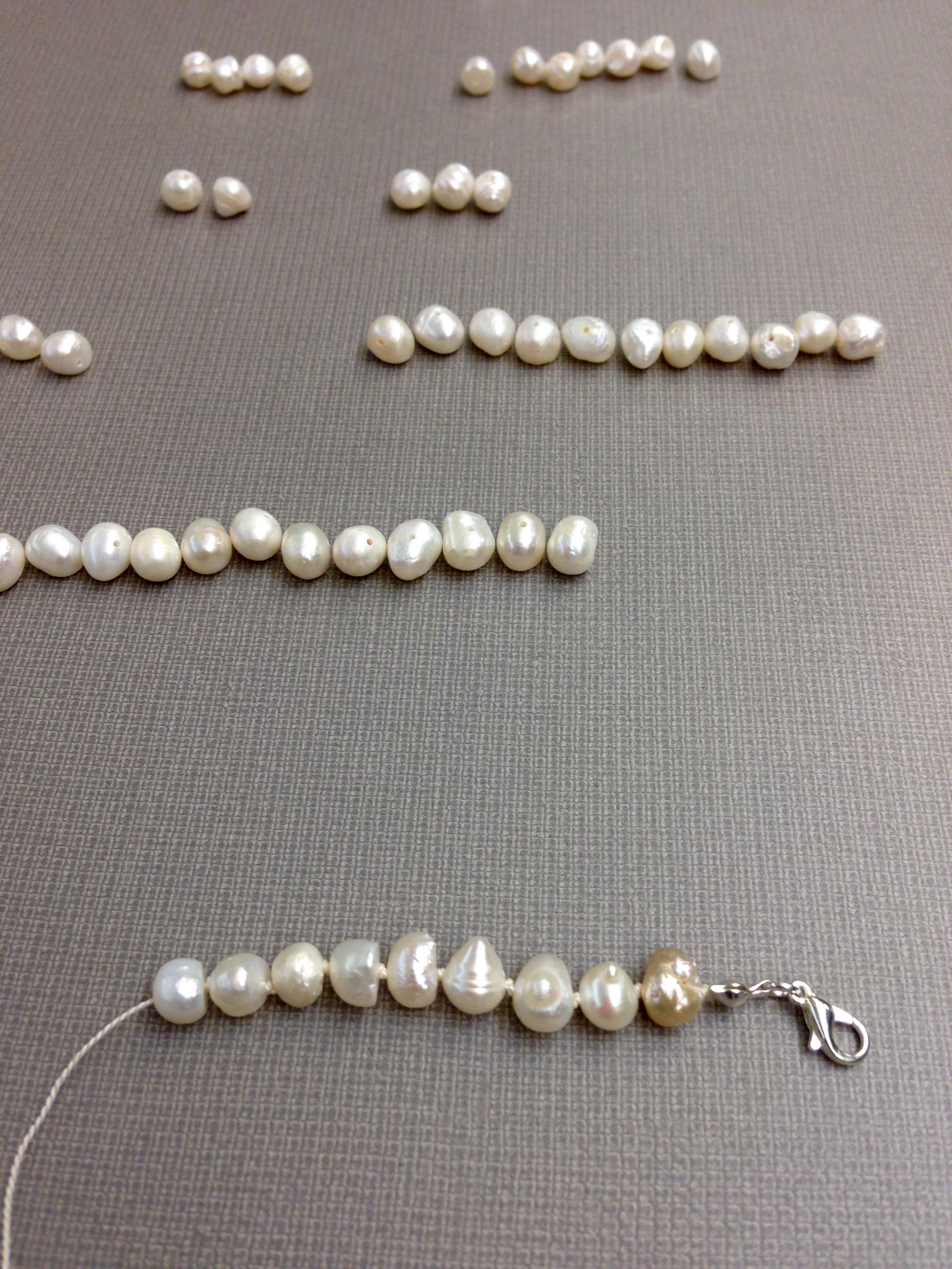 Before I started I neurotically laid out my pearls so the necklace would be symmetrical and the best and largest pearls would be in the front. I never miss an opportunity to be obnoxiously organized.