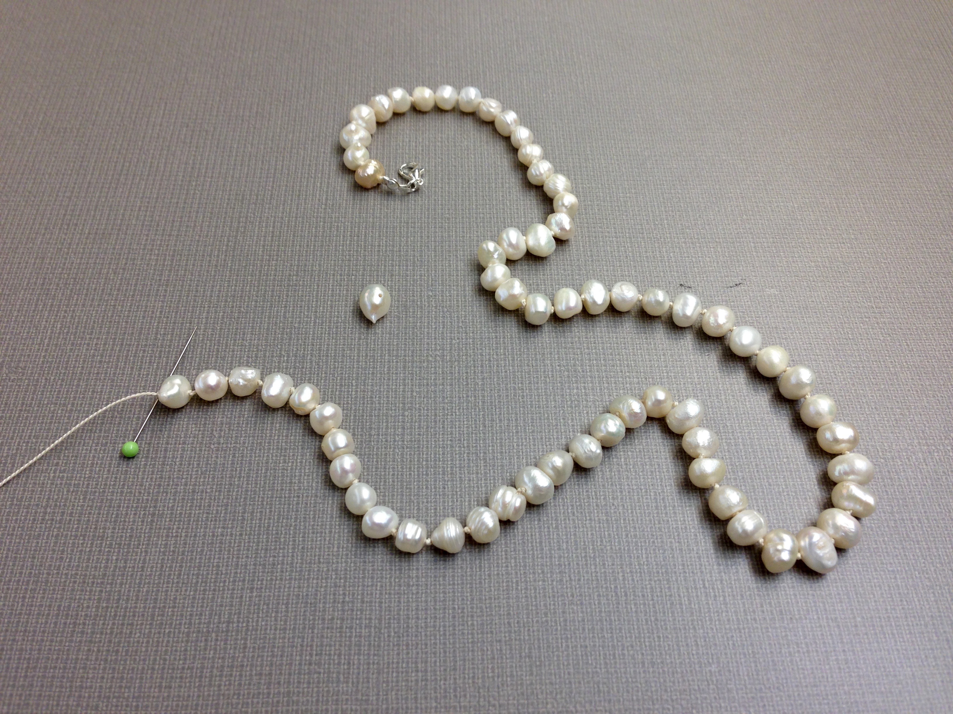 Each time I tied a knot I used a corsage pin to move the knot as close to the pearl in front of it as possible. Then, I used the next pearl in line to tighten it. I repeated these steps approximately 70 times. The process was pretty mistake-free, except for when I got distracted by work texts and started getting the string tangled around itself.