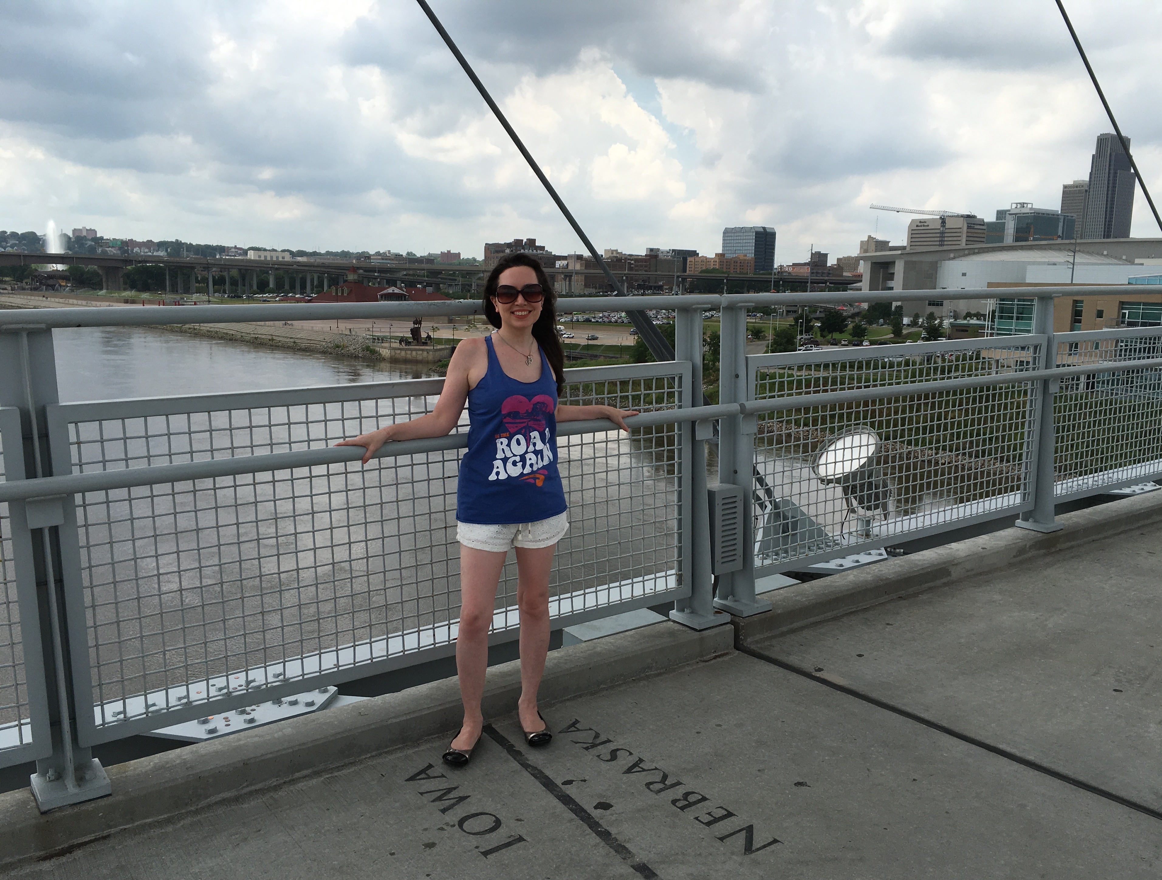 We made a quick stop in Omaha to go “bobbing” on the Bob Kerrey Pedestrian Bridge (standing with one foot in Iowa and the other in Nebraska). Being on the bridge is an interesting experience because you can feel it moving beneath your feet.